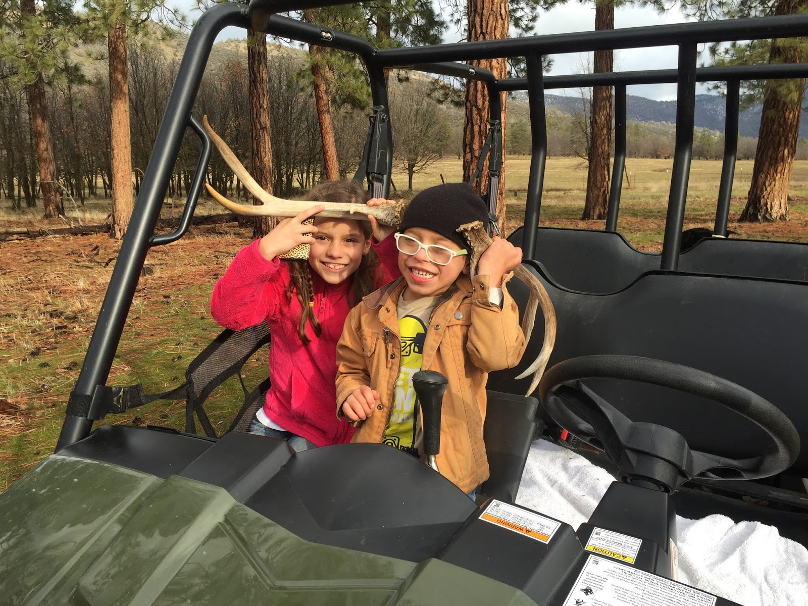 Day 2 was a little trickier. With the sledding plans washed out, the kids got cooped up in the house pretty quickly. Finally, during the briefest break in the weather, I piled them into the Ranger and went exploring. We had a rogue wild boar in one of the fields, so I put them on patrol to find it. We never saw him, but their lookout turned up two great shed antlers, so we had something to bring home.